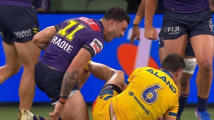 Parramatta went down to 12-men for the second time with Bailey Simonsson put in the sin bin for a professional foul. Melbourne took almost immediate advantage. Ativalu Lisati scored off a bit of Munster magic — his little grubber kick was spot on under pressure.