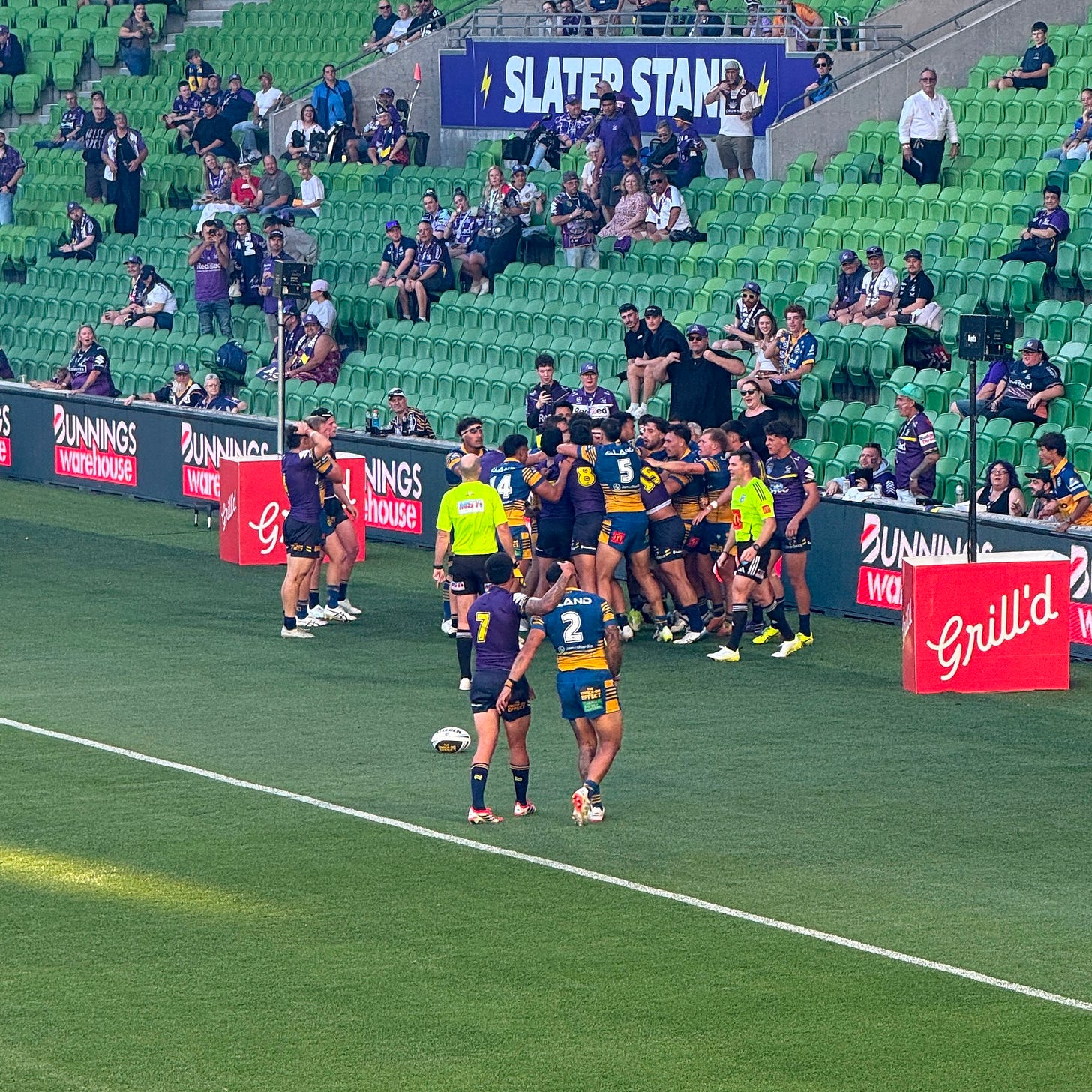 With the Storm well beaten, it was a chaotic ending to the match. Parramatta’s Bradley Avery was sent to the sin bin for a professional foul in the final minute and decided to exit the field via the deadball line. From a restart as time expired, Melbourne scored a try through Mitchell Jennings, from which a scuffle emerged in the Parramatta ingoal area. Avery got involved in the scuffle which seemed to give the officials a little bit of a conniption.