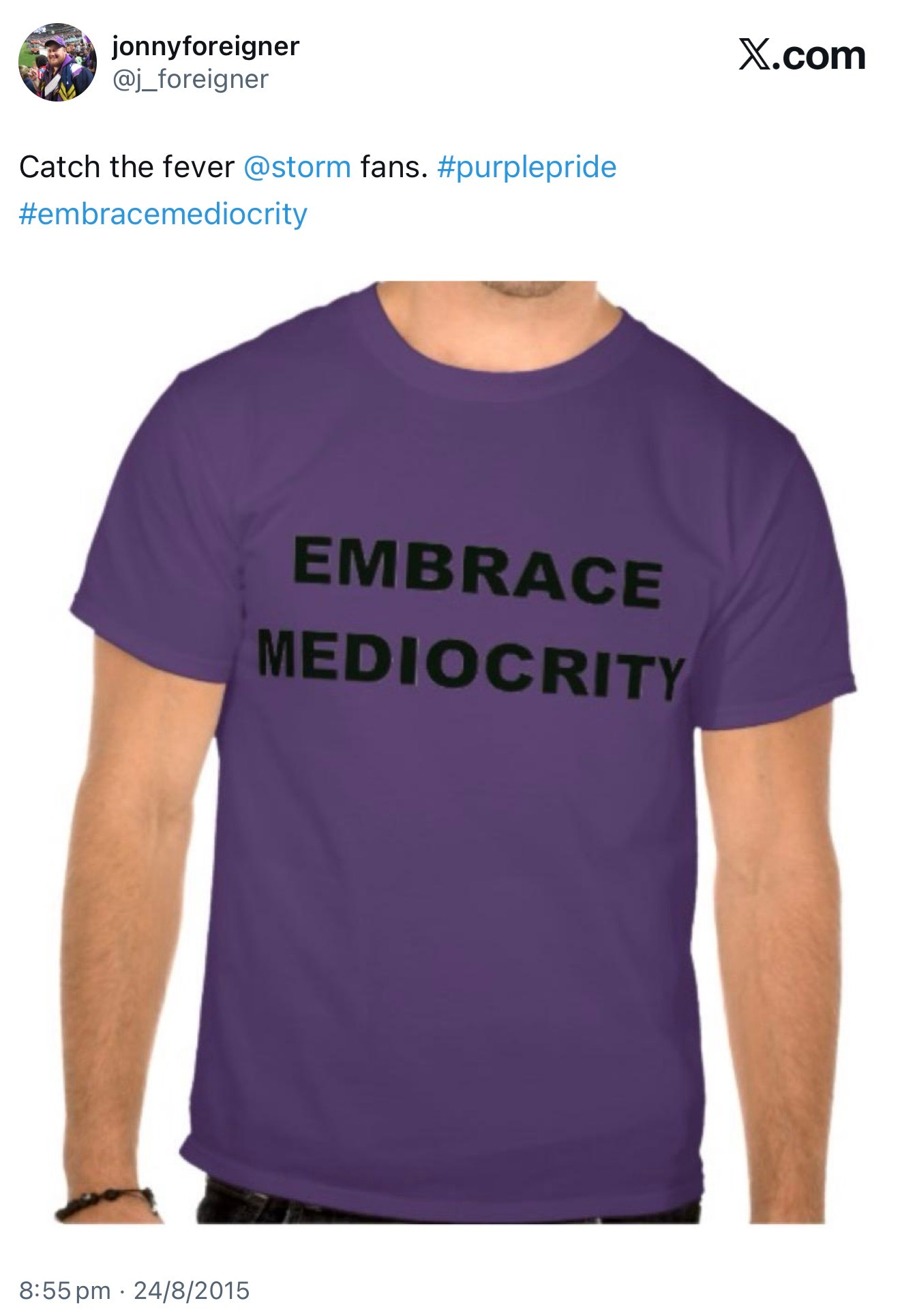 I’ve used the embrace mediocrity epithet for well over a decade whenever I’ve noticed standards slipping at the football teams that I support.6 I’m pretty sure I first used it about the Storm as early as 2014,7 but definitely in 2015 when that Storm team looked to be squandering their chance at a serious tilt at the premiership.