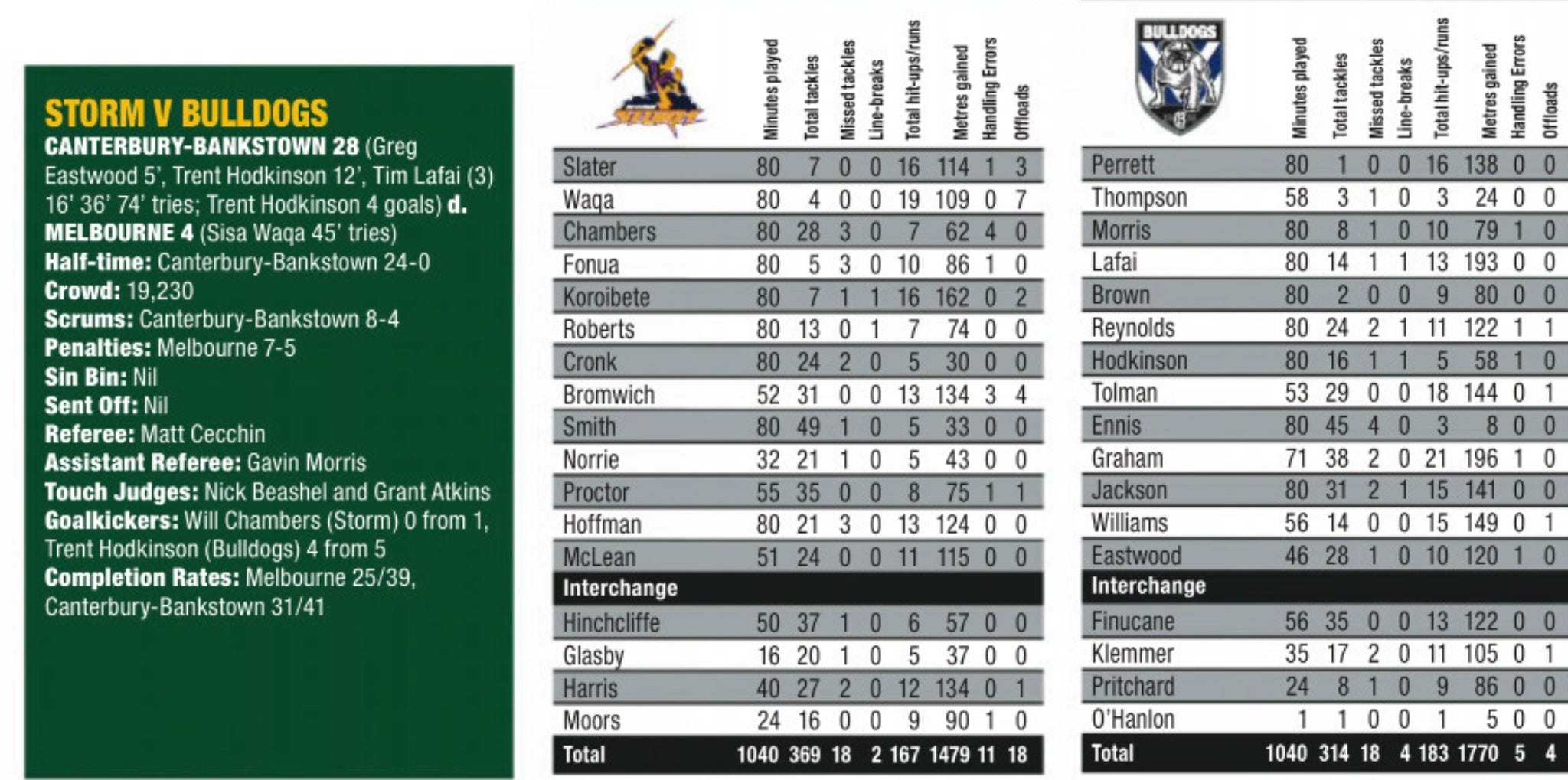 Melbourne bid farewell to Waqa and Ryan Hoffman (although he would famously return) following this match, and thankfully this was the last appearance in Storm colours by Ben Roberts.