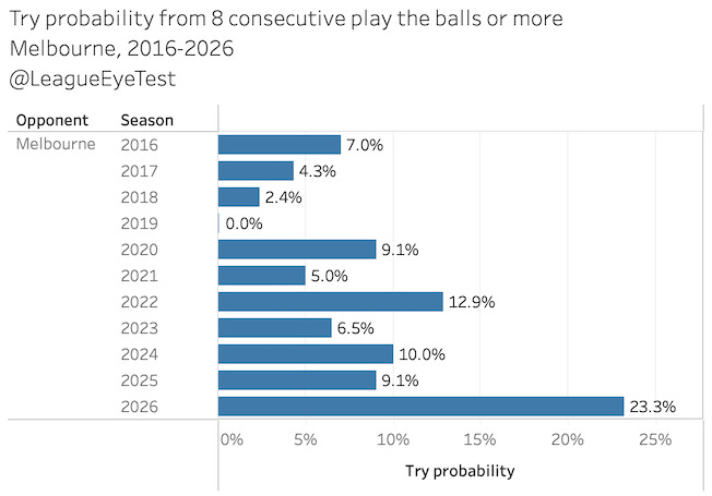 This year Craig Bellamy’s side has conceded the most tries from eight or more play the balls in the NRL at 10, and only two of them came from Penrith. The probability of scoring a try against Melbourne this year once you pass eight consecutive play the balls is the highest in the NRL at over 23%. Historically they’ve been very good in this area, never being above 12.9% after five rounds and they conceded zero in 2019.